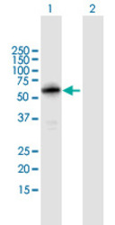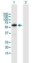 - Western Blot analysis of S100PBP expression in transfected 293T cell line (H00064766-T01) by S100PBP MaxPab polyclonal antibody.Lane 1: S100PBP transfected lysate(44.88 KDa).Lane 2: Non-transfected lysate.