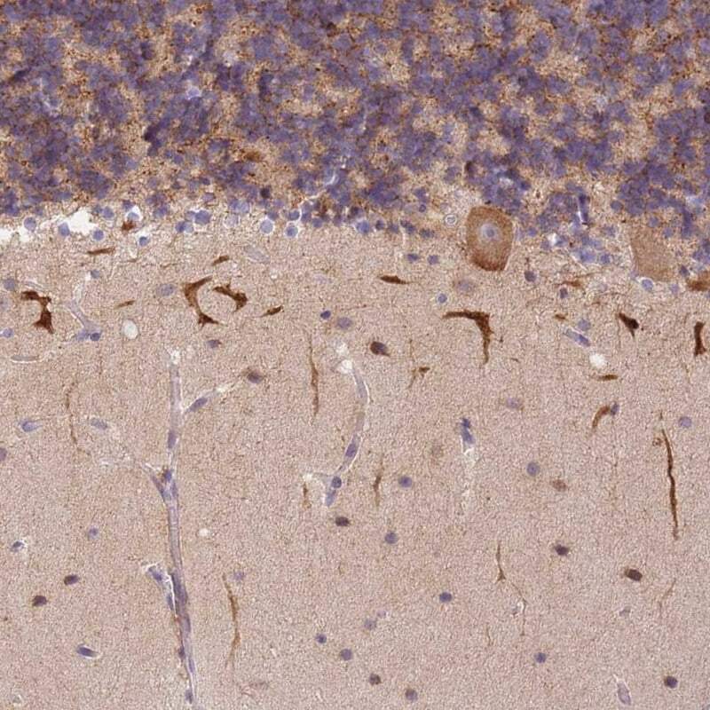 - Immunohistochemical staining of S100PBP in human cerebellum using a S100PBP Polyclonal Antibody (Product # PA5-55585) shows moderate cytoplasmic positivity in Purkinje cells.
