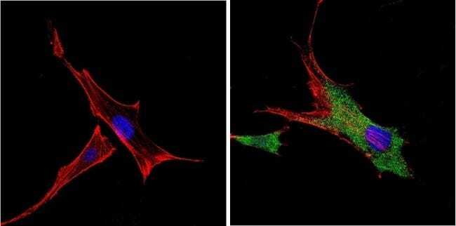 - Immunofluorescent analysis of VDAC (green) showing positive staining in the cytoplasm of NIH-3T3 cells (right) compared with a negative control in the absence of primary antibody (left). Formalin-fixed cells were permeabilized with 0.1% Triton X-100 in TBS for 5-10 minutes, blocked with 3% BSA-PBS for 30 minutes at room temperature and probed with a VDAC polyclonal antibody (Product # PA1-954A) in 3% BSA-PBS at a dilution of 1:200 and incubated overnight at 4 ºC in a humidified chamber. Cells were washed with PBST and incubated with a DyLight 488-conjugated goat-anti-rabbit IgG secondary antibody in PBS at room temperature in the dark. F-actin (red) was stained with a fluorescent red phalloidin and nuclei (blue) were stained with DAPI for 5-10 minutes in the dark. Images were taken at a magnification of 60x.