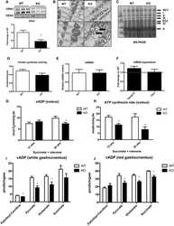 - Figure 5 Induction of cardiac GLUT4 in diabetes decreases respiratory chain complex activities in parallel with O- GlcNAc modifications of mitochondrial proteins. Specific respiratory complex activities in mitochondria isolated from Con and mG4H mice treated as in Fig. 1 E and beyond. NADH dehydrogenase CI activity ( A ) ( n = 4), succinate dehydrogenase CII activity ( B ) ( n = 4), coenzyme Q-cytochrome c reductase CIII activity ( C ) ( n = 4), and cytochrome c oxidase CIV activity ( D ) ( n = 3). E : Representative subunit protein levels from CI to CIV in isolated mitochondria corrected to VDAC. (CI, NDUFA9; CII, SDHB; CIII, UQCRC1; CIV, COX5I1.) F - I : Quantification of data presented in E . J : Mitochondrial protein O- GlcNAcylation in isolated mitochondria. K : O- GlcNAcylation of NDUFA9 as assessed by immunoprecipitation (IP) followed by O- GlcNAc immunoblot (IB). Quantitative data are means +- SEM. * P < 0.05 or ** P < 0.01 vs. Con-Veh.