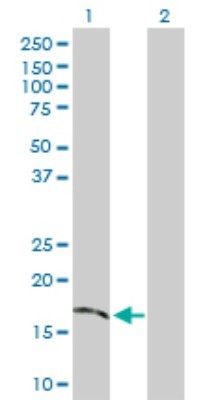 - Western Blot: TMEM54 Antibody [H00113452-D01P] - Analysis of TMEM54 expression in transfected 293T cell line by TMEM54 polyclonal antibody.Lane 1: TMEM54 transfected lysate(18.30 KDa).Lane 2: Non-transfected lysate.