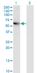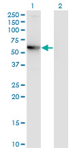 - Western Blot analysis of CCDC83 expression in transfected 293T cell line by MGC34732 monoclonal antibody (M01), clone 3E3.Lane 1: CCDC83 transfected lysate (Predicted MW: 48.8 KDa).Lane 2: Non-transfected lysate.