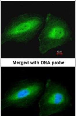 - Immunofluorescence analysis of paraformaldehyde-fixed HeLa, using CCDC83 antibody (Product # PA5-22025) at 1:200 dilution.