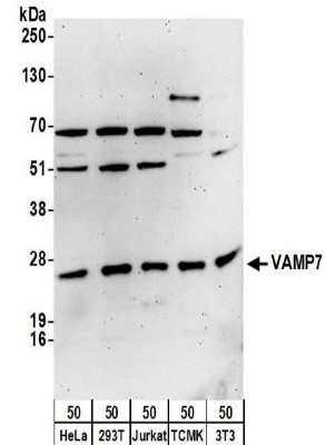 - Western Blot: VAMP-7 Antibody [NBP2-32232] - Samples: Whole cell lysate (50 ug) from HeLa, 293T, Jurkat, mouse TCMK-1, and mouse NIH3T3 cells. Antibodies: Affinity purified rabbit anti-VAMP7 antibody NBP2-32232 used for WB at 0.1 ug/ml. Detection: Chemiluminescence with an exposure time of 3 minutes.