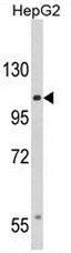 - Western blot analysis of CACNA2D3 Antibody (C-term) (Cat. #AP50703PU-N) in HepG2 cell line lysates (35μg/lane). CACNA2D3 (arrow) was detected using the purified Pab.
