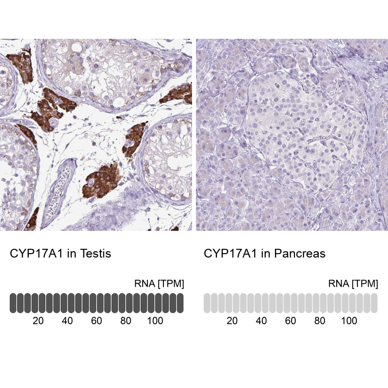 - Immunohistochemistry analysis in human testis and pancreas tissues using HPA048533 antibody. Corresponding CYP17A1 RNA-seq data are presented for the same tissues.