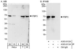 - Detection of human and mouse FBP3 by western blot (h&m) and immunoprecipitation (h). Samples: Whole cell lysate from HeLa (5, 15 and 50 µg for WB; 1 mg for IP, 20% of IP loaded), 293T (T; 50 µg) and mouse NIH3T3 (M; 50 µg) cells. Antibodies: Affinity purified rabbit anti-FBP3 antibody A303-012A used for WB at 0.04 µg/ml (A) and 1 µg/ml (B) and used for IP at 6 µg/mg lysate. FBP3 was also immunoprecipitated by rabbit anti-FBP3 antibody A303-013A, which recognizes a downstream epitope. Detection: Chemiluminescence with exposure times of 3 minutes (A) and 3 seconds (B).