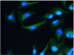 - Alpha Tubulin antibody staining of HeLa cells, green, nuclei are counterstained with DAPI.