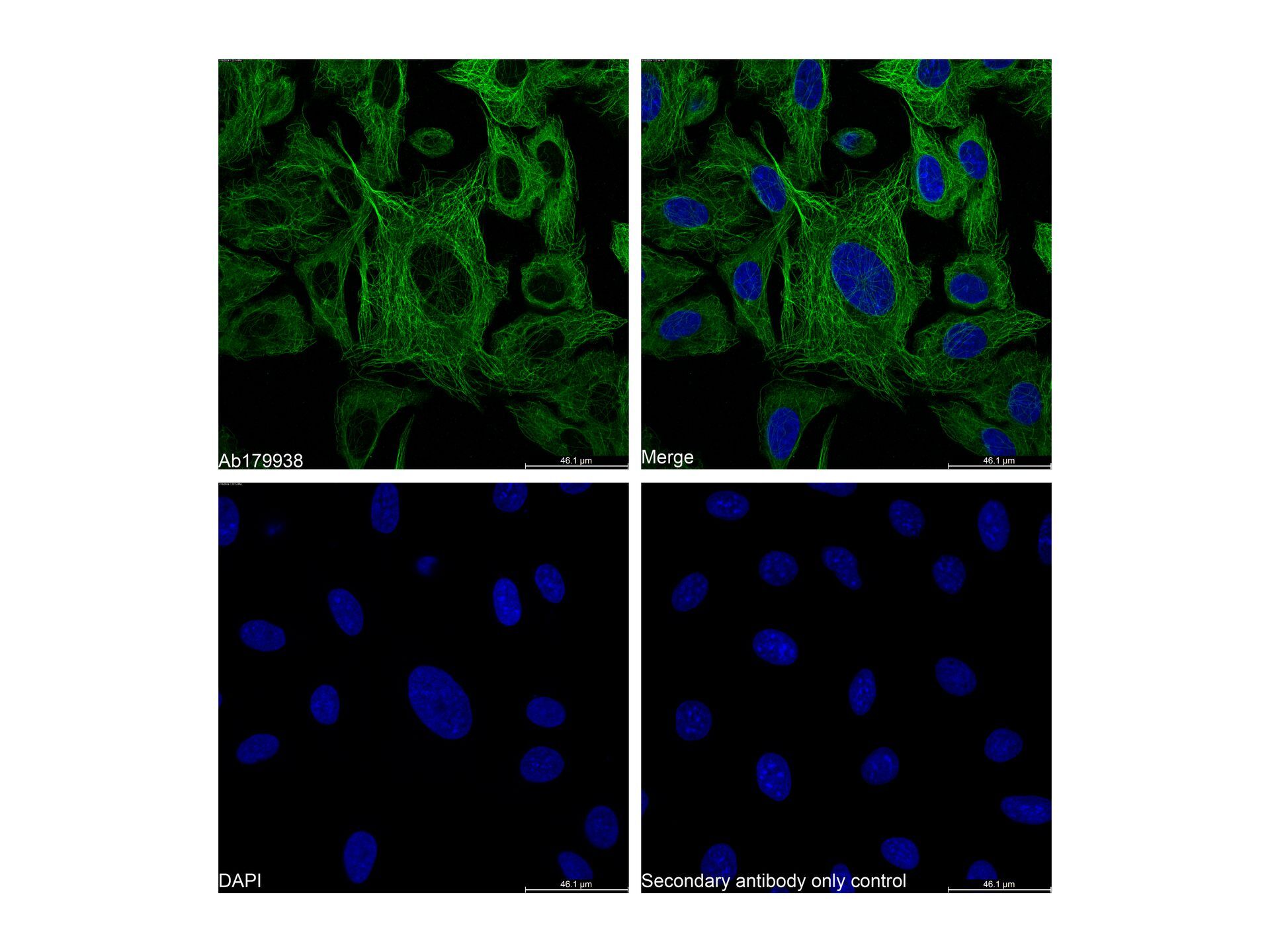 - alpha Tubulin Mouse mAb (Ab179938) - ICC/IF IF analysis of alpha Tubulin (Green) in HeLa cells. The cells were fixed and permeabilized with 100% methanol for 5 minutes, and blocked with 2% BSA for 1 hour at room temperature. Cells were stained with alpha Tubulin Mouse mAb (Ab179938) at 2.0 μg/mL in blocking buffer for 2 hour at RT and then incubated with Goat Anti-Mouse IgG H&L (FITC) (Ab179003) at a dilution of 1/500 for 1 hour at room temperature in the dark. Cells were counterstained with DAPI (Blue). Images were taken on the confocal laser scanning microscope.