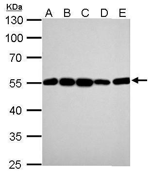 - alpha Tubulin antibody [GT114] detects TUBA1B protein by Western blot analysis.A. 30 µg Jurkat whole cell lysate/extract B. 30 µg Raji whole cell lysate/extract C. 30 µg K562 whole cell lysate/extract D. 30 µg THP-1 whole cell lysate/extract E. 30 µg NCI-H929 whole cell lysate/extract 10 % SDS-PAGEalpha Tubulin antibody [GT114] (GTX628802) dilution: 1:5000