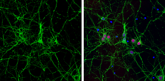 - alpha Tubulin antibody [GT114] detects alpha Tubulin protein expression by immunofluorescent analysis.Sample: Cultured rat E18 primary cortical neuron, DIV 8. Cells were fixed in 4% paraformaldehyde at RT for 15 min.Green: alpha Tubulin protein stained by alpha Tubulin antibody [GT114] (GTX628802) diluted at 1:250.Red: NeuN, stained by NeuN antibody (GTX132974) diluted at 1:250.Blue: Fluoroshield with DAPI (GTX30920).