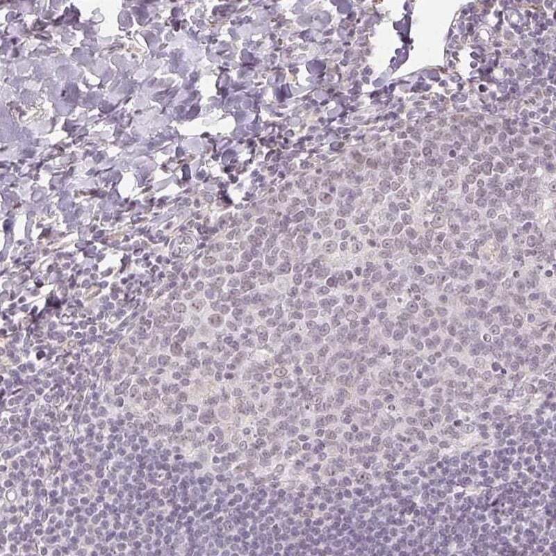 - Immunohistochemical analysis of AIF1L in human lymph node using AIF1L Polyclonal Antibody (Product # PA5-63358) shows no positivity in non-germinal center cells as expected.