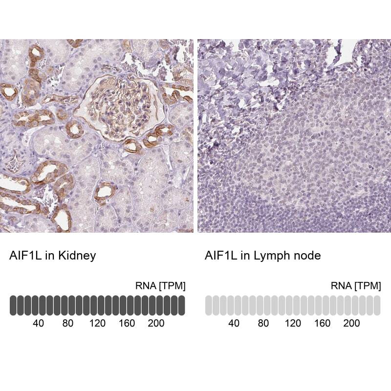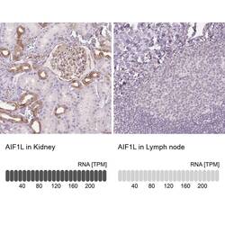 - Immunohistochemical staining of AIF1L in human kidney and lymph node tissues using AIF1L Polyclonal Antibody (Product # PA5-63358). Corresponding AIF1L RNA-seq data are presented for the same tissues.