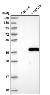 - Western Blot: C1orf216 Antibody [NBP1-83469] - Analysis in control (vector only transfected HEK293T lysate) and C1orf216 over-expression lysate (Co-expressed with a C-terminal myc-DDK tag (3.1 kDa) in mammalian HEK293T cells).