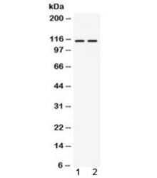 - Western blot testing of 1) rat thymus and 2) human 22RV1 lysate with AGO4 antibody at 0.5ug/ml. Predicted molecular weight ~97 kDa, observed here at ~115 kDa.
