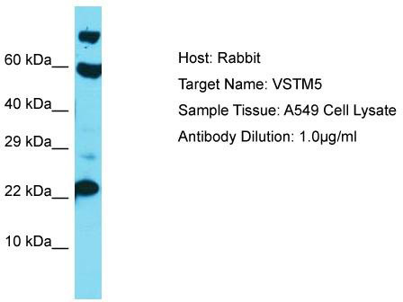 - Host: Rabbit; Target Name: VSTM5; Sample Tissue: A549 Whole Cell lysates; Antibody Dilution: 1.0 ug/ml