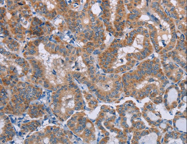 - Immunohistochemistry of paraffin-embedded Human thyroid cancer using POMT1 Polyclonal Antibody at dilution of 1:50.