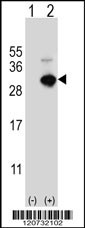 - Western blot analysis of GSTO1 (arrow) using rabbit polyclonal GSTO1 Antibody (Center) (Cat. #AP2930c). 293 cell lysates (2 ug/lane) either nontransfected (Lane 1) or transiently transfected (Lane 2) with the GSTO1 gene.