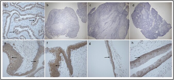 - Figure 5 Microphotograph of immunohistochemically stained FAM107A protein in: fallopian tube (control) ( a ), LSCC ( b - d ) and non-tumor controls ( e - h ). Nucleus counterstained with hematoxylin, arrows indicate positive nuclear/cytoplasmic staining (brown), primary objective magnification 10x.