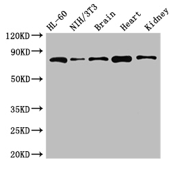 - Positive WB detected in:HL-60 whole cell lysate,NIH/3T3 whole cell lysate,Mouse brain tissue,Mouse heart tissue,Mouse kidney tissue;All lanes:ABCB9 antibody at 5ug/ml;Secondary;Goat polyclonal to rabbit IgG at 1/50000 dilution;Predicted band size: 85,80,67,76,78 kDa;Observed band size: 85 kDa;