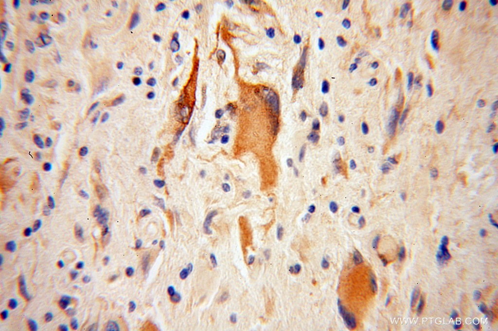 - Immunohistochemical of paraffin-embedded human gliomas using 13986-1-AP(ANGPTL5 antibody) at dilution of 1:100 (under 10x lens)