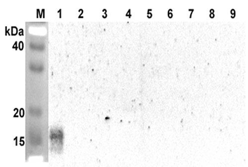 - Western blot analysis using anti-ANGPTL5 (CCD) (human), pAb at 1:2000 dilution. 1: Human ANGPTL5 (CCD) (FLAG-tagged). 2: Human ANGPTL5 (FLD) (FLAG-tagged). 3: Human ANGPTL2 (CCD) (FLAG-tagged). 4: Human ANGPTL3 (CCD) (FLAG-tagged). 5: Human ANGPTL4 (CCD) (FLAG-tagged). 6: Human ANGPTL6 (FLAG-tagged). 7: Human ANGPTL3 (FLAG-tagged). 8: Human ANGPTL4 (FLAG-tagged). 9: Human ANGPTL7 (FLAG-tagged).