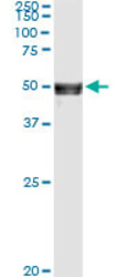 - Western Blot analysis of ANGPTL5 expression in transfected 293T cell line by ANGPTL5 monoclonal antibody (M01), clone 1B2.Lane 1: ANGPTL5 transfected lysate(44.2 KDa).Lane 2: Non-transfected lysate.