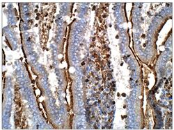 - Immunohistochemistry of rat small intestine with Anti-ANGPTL5 primary antibody (STJ500084) at 1:50 dilution in Buffer. Section was treated with DAB and Haematoxylin stain. Magnification is at 40X.