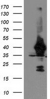 - HEK293T cells were transfected with the pCMV6-ENTRY control (Left lane) or pCMV6-ENTRY UNG (RC222868, Right lane) cDNA for 48 hrs and lysed. Equivalent amounts of cell lysates (5 µg per lane) were separated by SDS-PAGE and immunoblotted with anti-UNG. Positive lysates LY408998 (100 µg) and LC408998 (20 µg) can be purchased separately from OriGene.