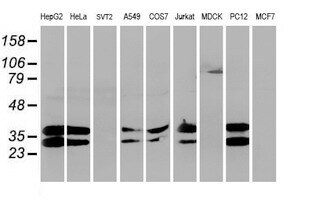 - Western blot analysis of extracts (35 µg) from 9 different cell lines by using anti-UNG monoclonal antibody.