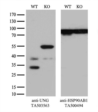 - Equivalent amounts of cell lysates (10 µg per lane) of wild-type HeLa cells (WT, Cat# LC810HELA) and UNG-Knockout HeLa cells (KO, Cat# LC830875) were separated by SDS-PAGE and immunoblotted with anti-UNG monoclonal antibody TA503563(1:500). Then the blotted membrane was stripped and reprobed with anti-HSP90 antibody as a loading control.