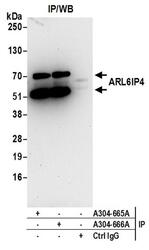 - Detection of human ARL6IP4 by western blot of immunoprecipitates. Samples: Whole cell lysate (0.5 or 1.0 mg per IP reaction; 20% of IP loaded) from 293T cells prepared using NETN lysis buffer. Antibodies: Affinity purified rabbit anti-ARL6IP4 antibody A304-665A (lot A304-665A-1) used for IP at 6 µg per reaction. ARL6IP4 was also immunoprecipitated by rabbit anti-ARL6IP4 antibody A304-666A. For blotting immunoprecipitated ARL6IP4, A304-665A was used at 0.4 µg/ml. Detection: Chemiluminescence with an exposure time of 30 seconds.