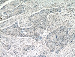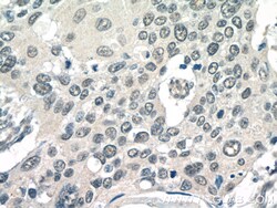 - Immunohistochemistry of paraffin-embedded human cervical cancer tissue slide using 10581-1-AP (POT1 Antibody) at dilution of 1:100 (under 40x lens).