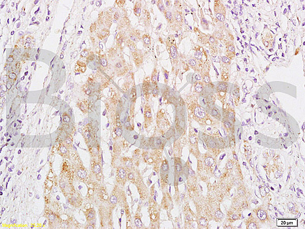 - Formalin-fixed and paraffin embedded human liver carcinoma labeled with Anti-FUT1 Polyclonal Antibody, Unconjugated (bs-7636R) at 1:200 followed by conjugation to the secondary antibody and DAB staining