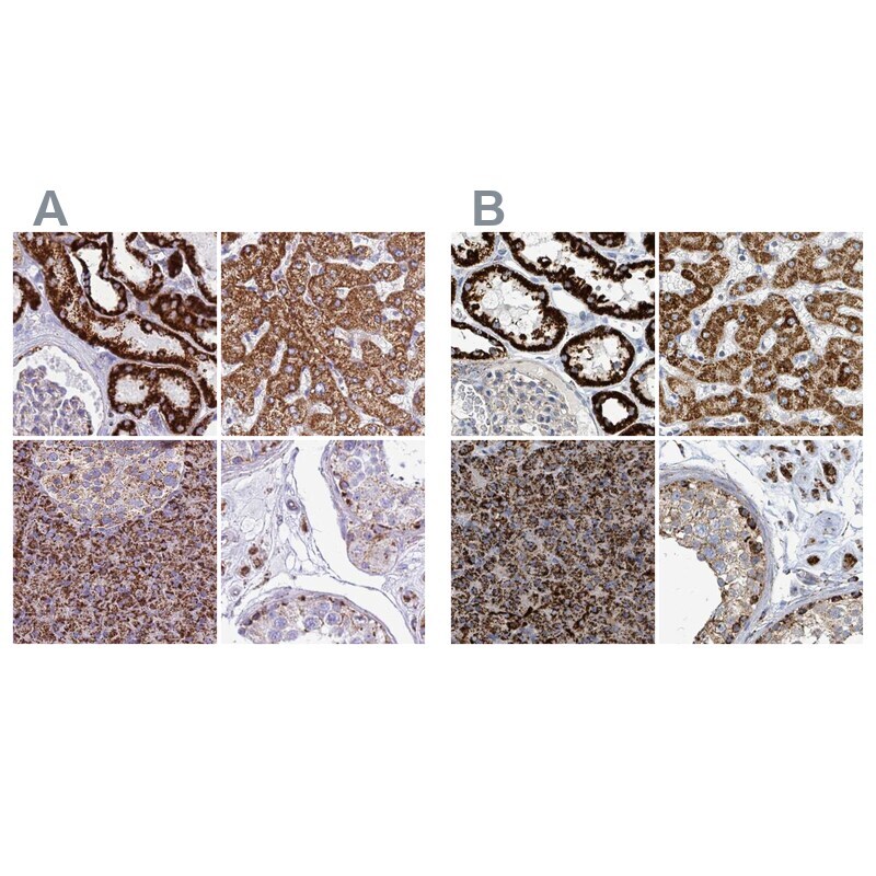 - Immunohistochemical staining of SUCLG2 in human kidney, liver, pancreas and testis using SUCLG2 Polyclonal Antibody (Product # PA5-61289) (A) shows similar protein distribution across tissues to an independent SUCLG2 Polyclonal Antibody (B).