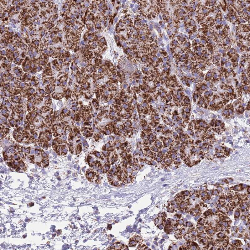- Immunohistochemical staining of SUCLG2 in human pancreas using SUCLG2 Polyclonal Antibody (Product # PA5-61289) shows weak to moderate positivity in mitochondria in exocrine glandular cells.