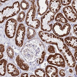 - Immunohistochemical staining of SUCLG2 in human kidney using SUCLG2 Polyclonal Antibody (Product # PA5-61289) shows strong positivity in mitochondria in cells in tubules.