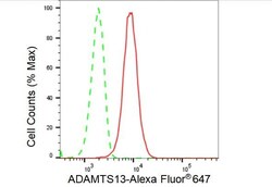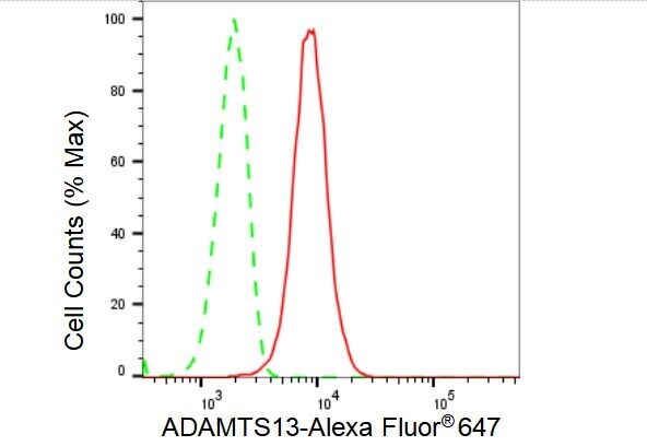- Flow cytometry analysis of ADAMTS13 in HeLa cells using ADAMTS13 recombinant monoclonal antibody (Product # MA5-52640) at a dilution of 1:2,000. Green, isotype control; red, ADAMTS13.