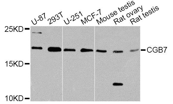 - Western blot analysis of extracts of various cell lines, using CGB7 Antibody at 1:1000 dilution. The secondary antibody used was an HRP Goat Anti-Rabbit IgG (H+L) at 1:10000 dilution. Lysates were loaded 25ug per lane and 3% nonfat dry milk in TBST was used for blocking. An ECL Kit was used for detection and the exposure time was 90s.