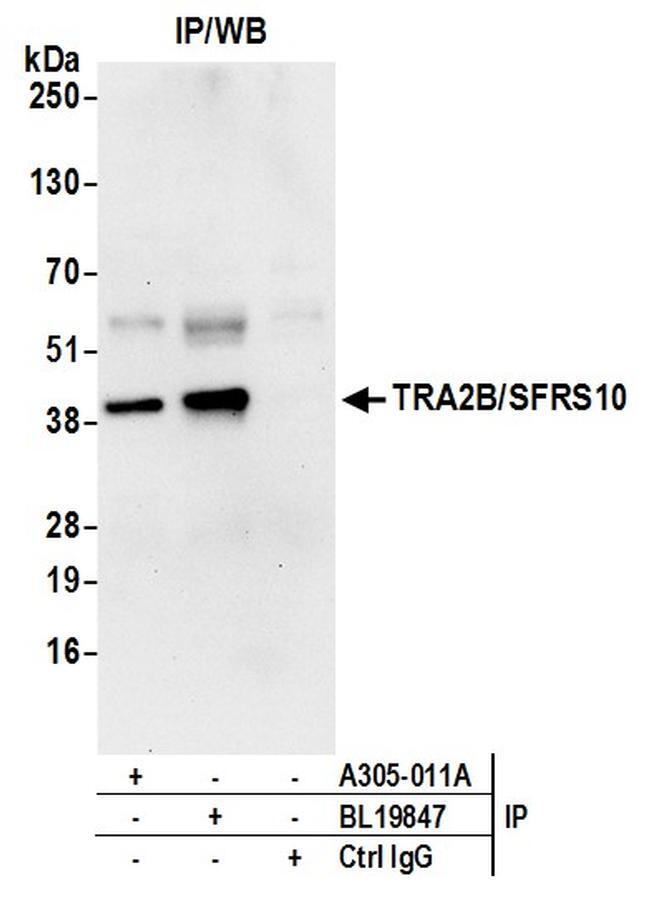 - Detection of human TRA2B/SFRS10 by western blot of immunoprecipitates. Samples: Whole cell lysate (0.5 or 1.0 mg per IP reaction; 20% of IP loaded) from HeLa cells prepared using NETN lysis buffer. Antibodies: Affinity purified rabbit anti-TRA2B/SFRS10 antibody A305-011A (lot A305-011A-1) used for IP at 6 µg per reaction. TRA2B/SFRS10 was also immunoprecipitated by rabbit anti-TRA2B/SFRS10 antibody BL19847. For blotting immunoprecipitated TRA2B/SFRS10, A305-011A was used at 1 µg/ml. Detection: Chemiluminescence with an exposure time of 30 seconds.