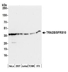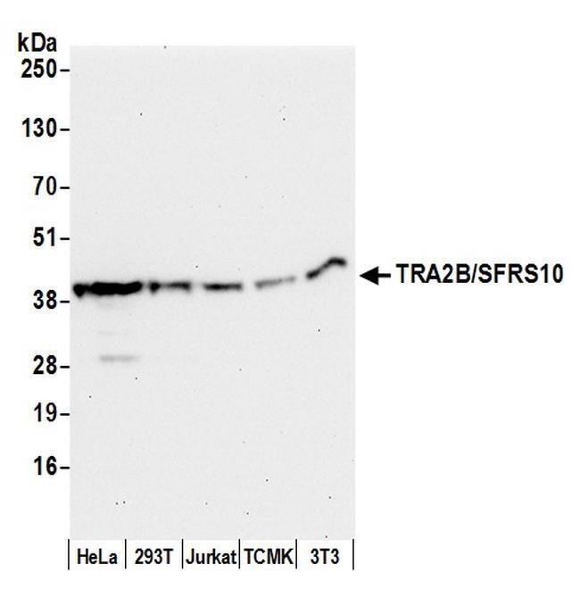 - Detection of human and mouse TRA2B/SFRS10 by western blot. Samples: Whole cell lysate (50 µg) from HeLa, 293T, Jurkat, mouse TCMK-1, and mouse NIH3T3 cells prepared using NETN lysis buffer. Antibody: Affinity purified rabbit anti-TRA2B/SFRS10 antibody A305-011A (lot A305-011A-1) used for WB at 0.1 µg/ml. Detection: Chemiluminescence with an exposure time of 30 seconds.