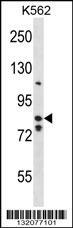 - BACH2 Antibody (Center) (Cat. #AP14653c) western blot analysis in K562 cell line lysates (35ug/lane).This demonstrates the BACH2 antibody detected the BACH2 protein (arrow).