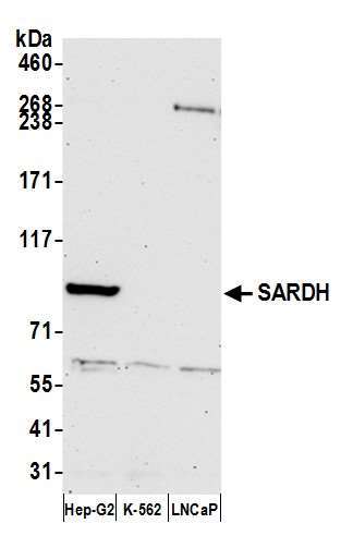 - Detection of human SARDH by western blot. Samples: Whole cell lysate (50 µg) from Hep-G2, K-562, and LNCaP cells prepared using NETN lysis buffer. Antibody: Affinity purified rabbit anti-SARDH antibody A305-855A-M (lot A305-855A-M-1) used for WB at 1:1000. Detection: Chemiluminescence with an exposure time of 75 seconds.