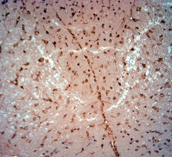 - IHC-P on paraffin sections of rat spinal cord.The animal was perfused using Autoperfuser at a pressure of 130 mmHg with 300 ml 4% FA being processed for paraffin embedding. HIER: Tris-EDTA, pH 9 for 20 min using Thermo PT Module.Blocking: 0.2% LFDM in TBST filtered thru 0.2 um. Detection was done using Novolink HRP polymer from Leica following manufacturer's instructions; DAB chromogen. Primary antibody dilution 1: 500, incubated 30 min at RT using Autostainer. Sections were counterstained with Harris Hematoxylin