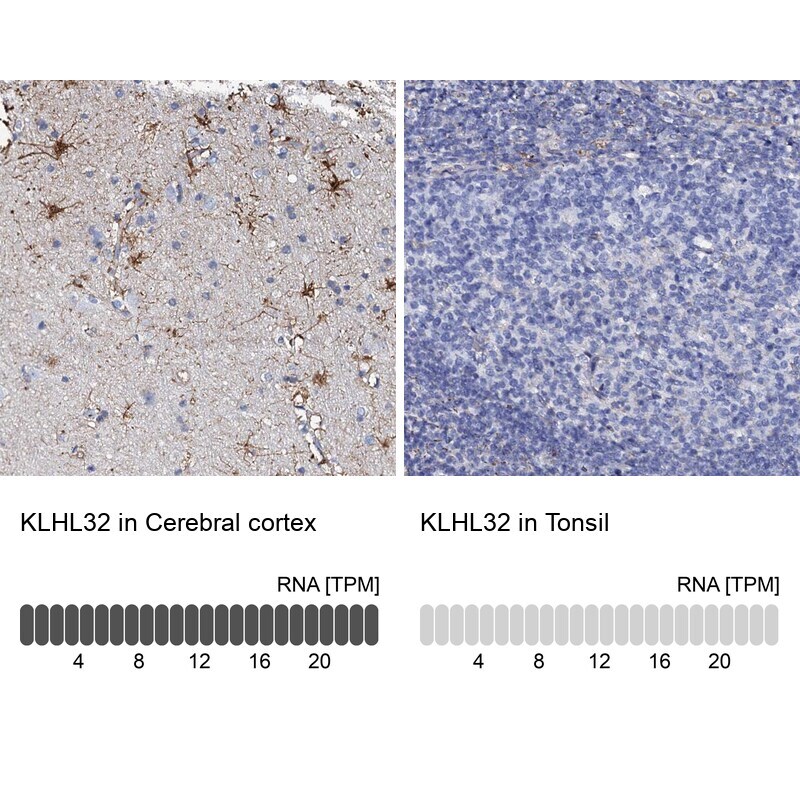 - Immunohistochemical staining of KLHL32 in human cerebral cortex and tonsil tissues using KLHL32 Polyclonal Antibody (Product # PA5-58672). Corresponding KLHL32 RNA-seq data are presented for the same tissues.