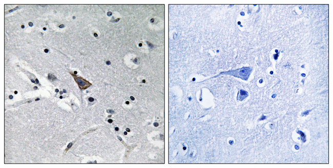 - Immunohistochemistry analysis of paraffin-embedded human brain, using SLC6A16 Antibody. The picture on the right is blocked with the synthesized peptide.