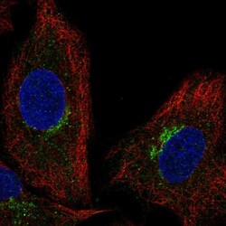 - Immunofluorescent staining of human cell line A549 shows localization to the Golgi apparatus.