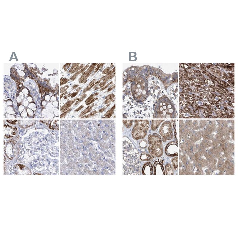 - Immunohistochemical staining of COQ3 in human colon, heart muscle, kidney and liver using COQ3 Polyclonal Antibody (Product # PA5-56699) (A) shows similar protein distribution across tissues to an independent COQ3 Polyclonal Antibody (B).