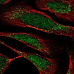 - Immunofluorecent analysis of COQ3 in human cell line U-2 OS using COQ3 Polyclonal Antibody (Product # PA5-56699). Staining shows localization to nucleoplasm and mitochondria.