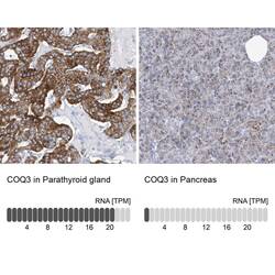 - Immunohistochemical staining of COQ3 in human parathyroid gland and pancreas tissues using COQ3 Polyclonal Antibody (Product # PA5-56699). Corresponding COQ3 RNA-seq data are presented for the same tissues.